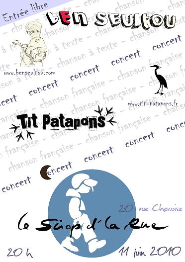 - Lun 21 Juin 2010 à Grenoble / scène place St André Tit Patapons sur la scène Chanson place St André à 23h30, avec Phil Herisson, Mieux (Têtes en l'air) & Lilapoem Voir le fly